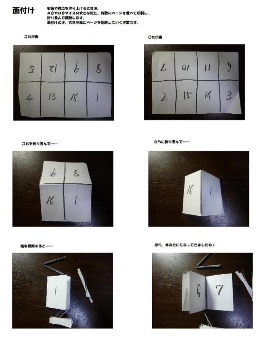 以下の画像は1例であるが、このように配置しておけば、折りたたんで裁断したときに、書籍のページ順にきちんと並んだものができるのだ。
