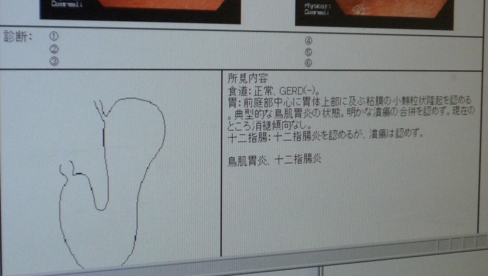 「はははは(笑)。M先生の診断結果がここにあるねんけど、胃の上部……入口よりもさらに上の方は、あんまり荒れてないねん。他は全体的にこういう(鳥肌状の)感じ」