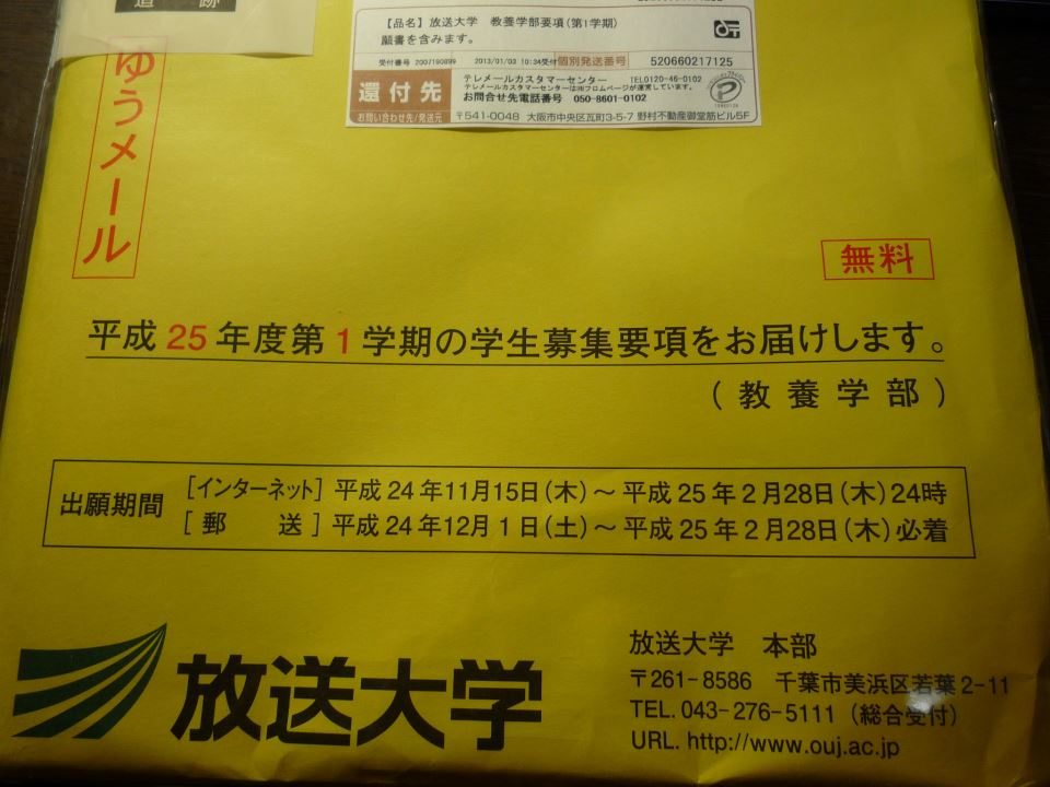 放送大学から、来学期の学生募集要項をお送りいただきました。