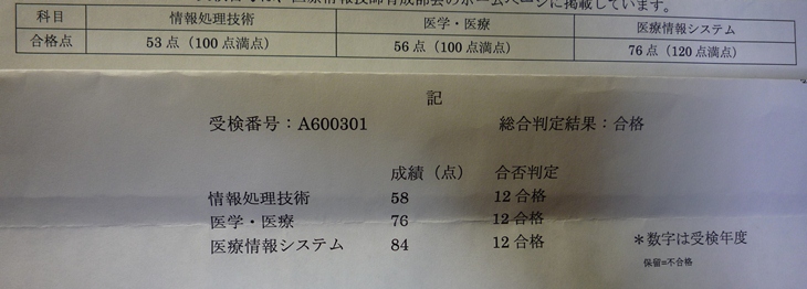 医療情報技師能力検定試験 合否判定結果通知書が届きました。