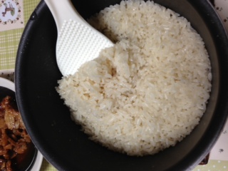 分量の麦茶に米を1時間ほどつけておいたあと、IHクッキングヒーターで普通に調理(強火1分→弱火10分弱→最後に数秒だけ強火)。