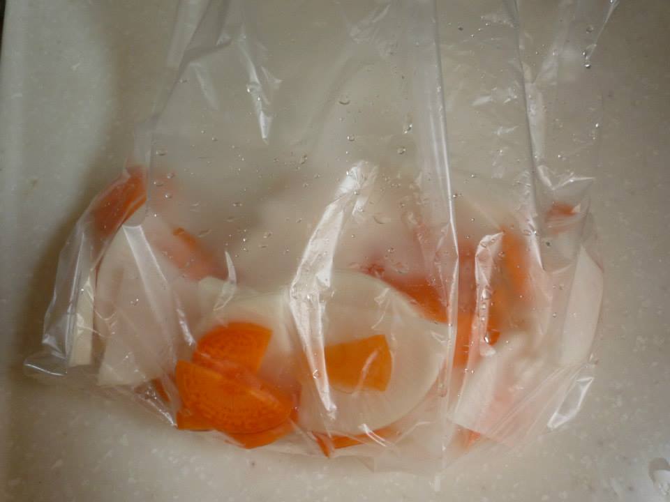 3.ビニール袋に入れて、電子レンジの「根菜」というメニューで調理しておく。