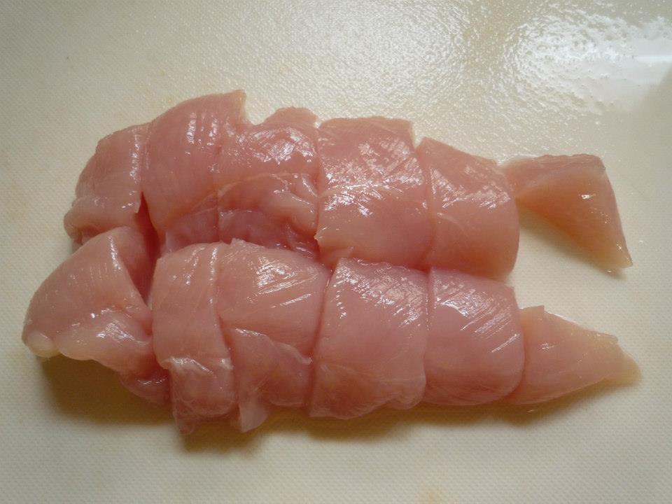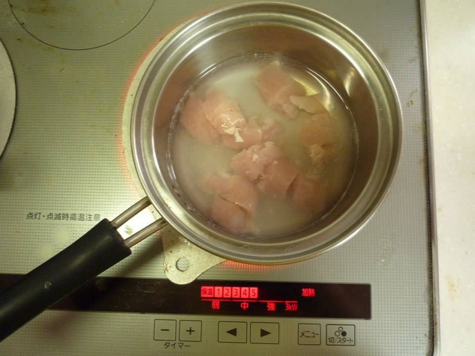 5.鶏がらスープ200㏄で鶏ささみを煮る。アクはしっかりとる。