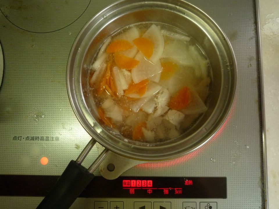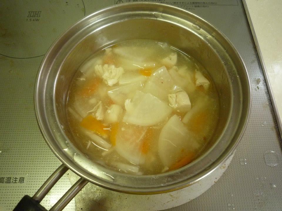 6.鶏ささみに火が通ったら。3.の大根・にんじんを入れて、だいたい10分ほど煮る。