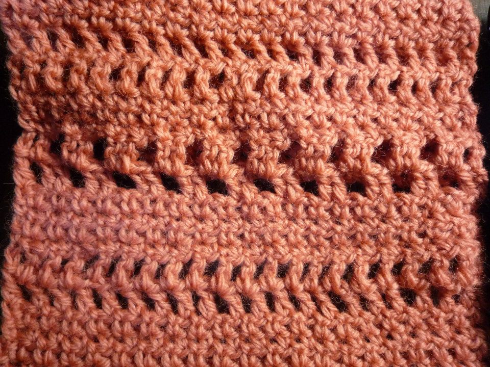 細編み+鎖編みだけだと、やや重たい印象になったので、13段目から長編み(ながあみ)と鎖編みを繰返すのを6段ほど入れ、再び細編み+鎖編みに戻す方法で、全体としてはシマシマ模様のマフラーにしようかと。編み進めてみて「どうも違う」となったら、また考えます。