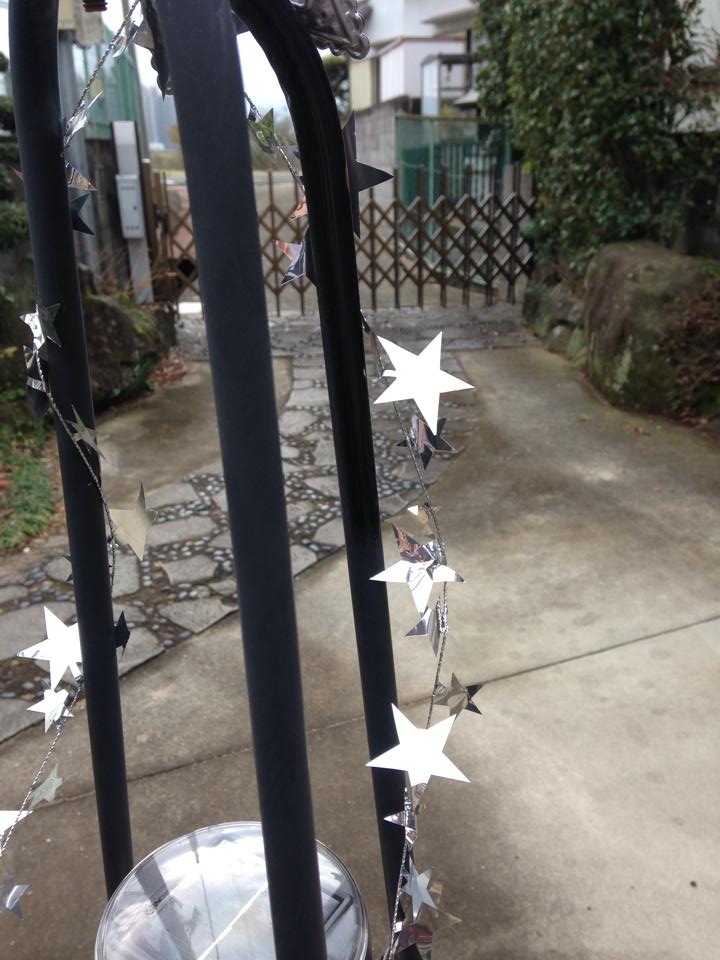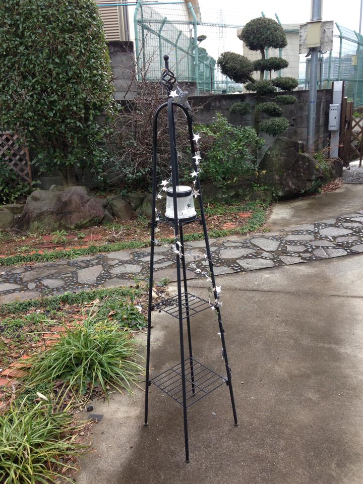 庭にあったもの(植木鉢とかを飾るもの?)と100均で買った飾りで、謎のクリスマスオブジェを作ってみた。