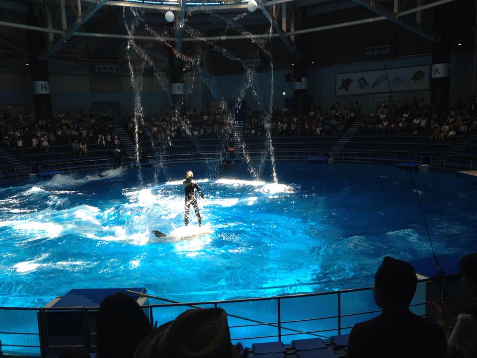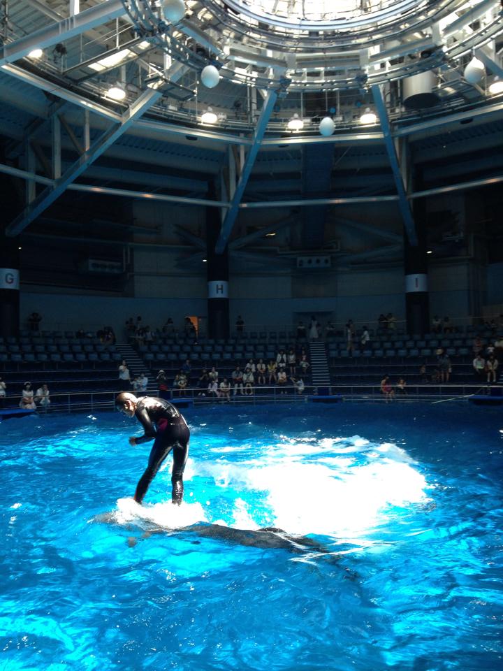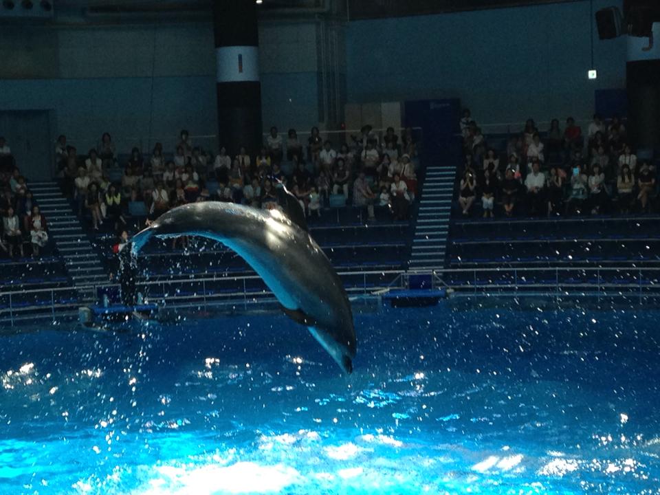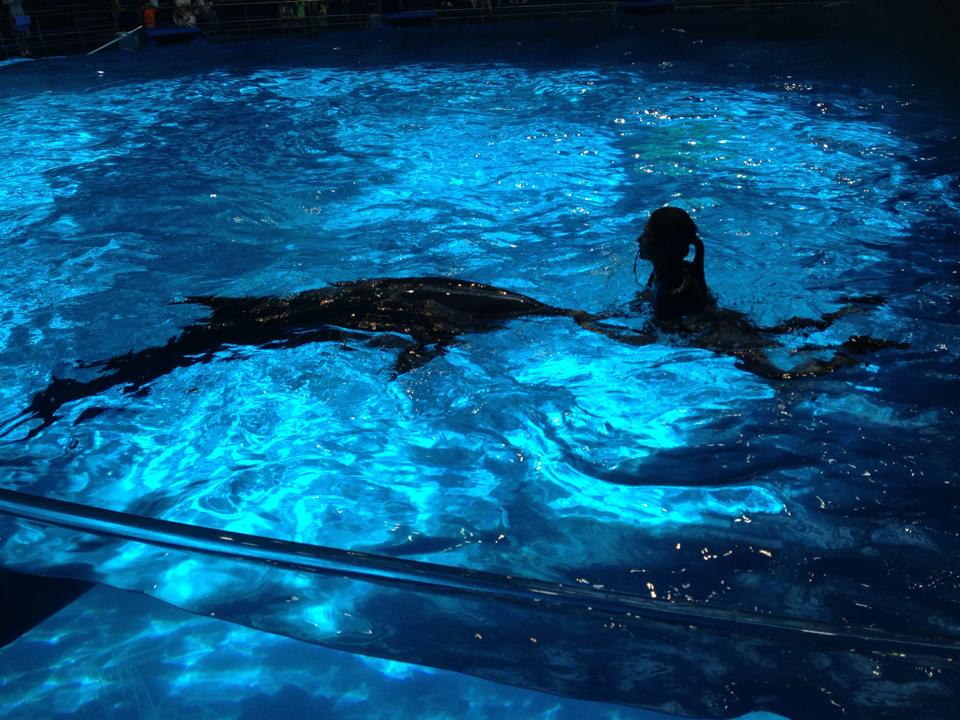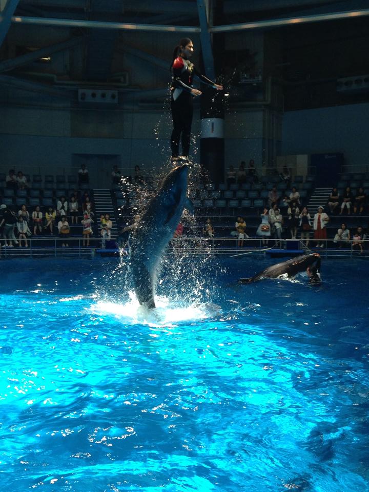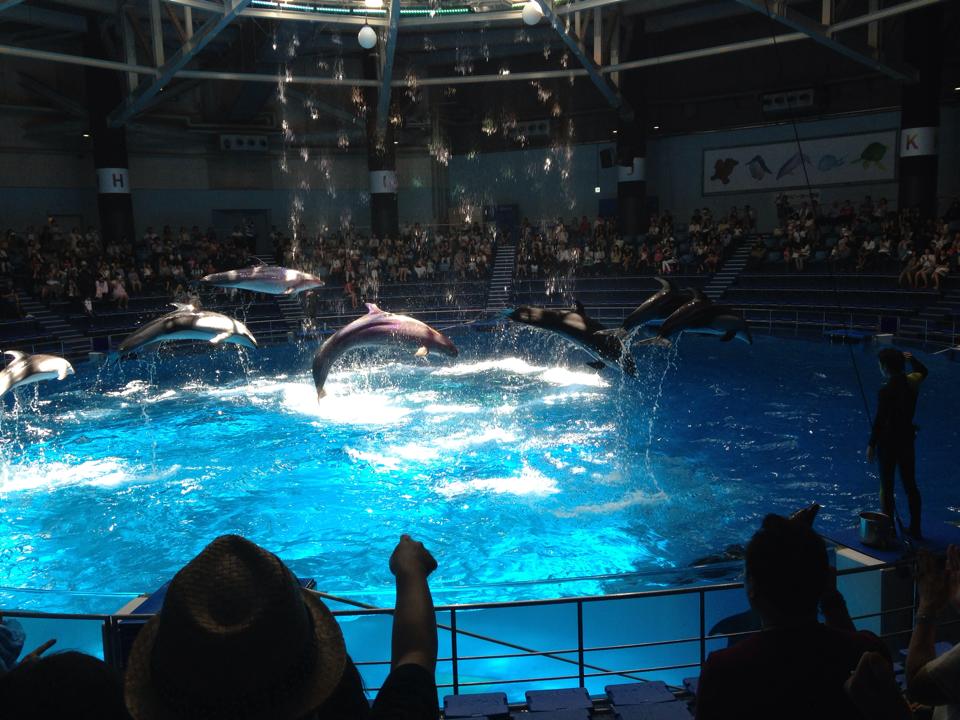 日本の水族館で行われる「イルカショー」のイメージとはずいぶん違って、ミュージカルのような派手さがある。