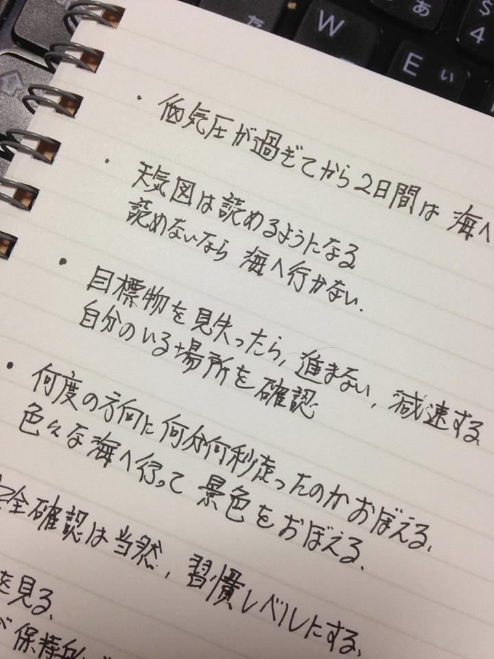 天気図・天気のこと、進路のこと、帰港のこと、目標物の定め方、目標物を見失ったときの方法……。